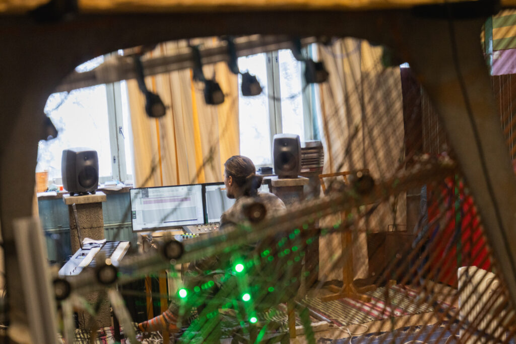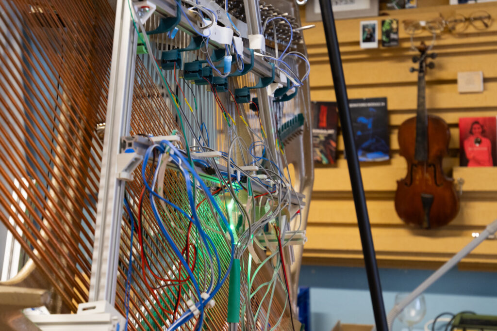 Sen sijaan tilaan on sovitettu muun muassa miksauspiste, kahvittelutila ja pianon sisuskalut, josta roikkuu erinäisiä johtoja. Kyseessä on työn alla oleva installaatio, jossa tietokoneohjatut sähkömagneetit, moottorit ja muut laitteet soittavat akustisen pianon sisuksista irrotettua harppua eli metallista runkoa, jossa pianon kielet ovat kiinni.