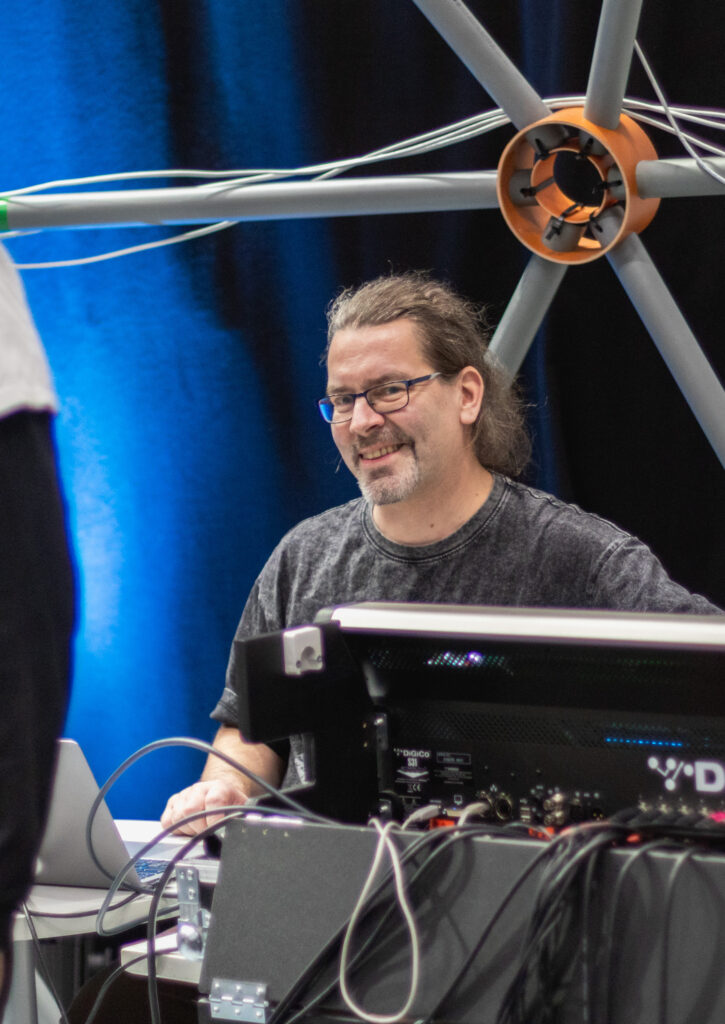 Jussi Alaraasakan tehtäväksi jäi levittää teosten äänimaisema ympäri sound domea. Kuva: Jaakko Suomela.
