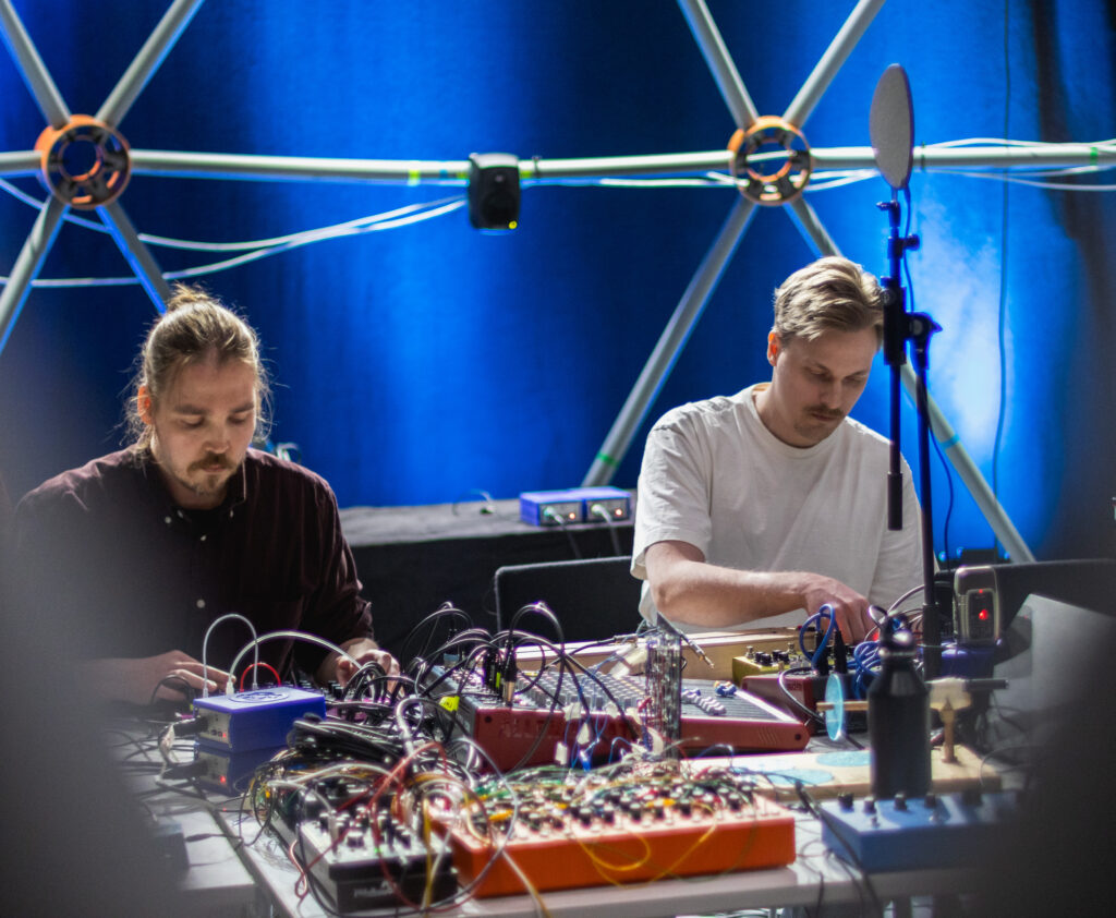 Aalto-yliopistossa opiskeleva Antero Huttunen (oik.) esiintyi itserakentamallaan soittimella yhdessä oululaisen Matti Puljun kanssa, joka oli valinnut soittimekseen rumpusyntetisaattorin. Kuva: Jaakko Suomela.