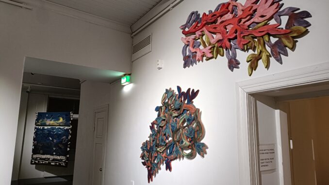 Näyttelystä löytyy maalausten lisäksi muun muassa kangastöitä, puisia veistoksia sekä mediataidetta.