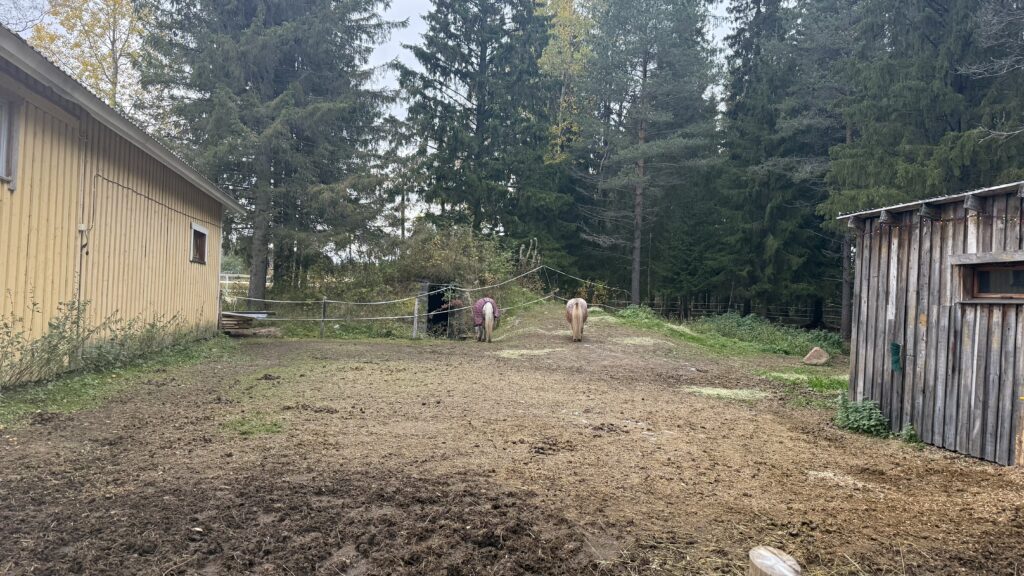 Töiden ohella hevoset viettävät lähes kaiken aikaansa ulkoilemalla tarhoissa ja pihatoissa. Normaalin hiekkapohjaisten tarhojen lisäksi niillä on pääsy myös metsäalueelle, jossa ne pääsevät leikkimään, kaivelemaan ja elämään mahdollisimman lajityypillistä hevosen elämää. Niillä on myös mahdollisuus päästä kuivaan paikkaan lepäämään.