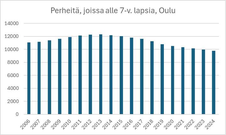 Alle kouluikäisiä lapsia sisältäviä perheitä oli vuonna 2024 Oulussa 9 771 kappaletta, mikä on koko mittaushistorian alhaisin määrä. Vuonna 2014 vastaava lukema oli 12 185 perhettä.