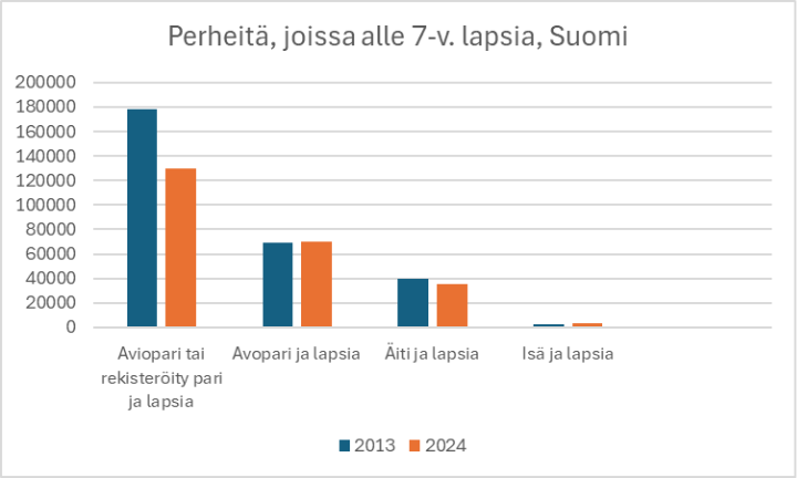 Tilastokeskuksen perhetilastokatsauksen mukaan vuoden 2024 lopussa Suomessa oli 238 453 sellaista perhettä, jossa oli alle 7-vuotiaita lapsia. Määrä on laskenut 24,2 prosenttia vuoteen 1994 verrattuna, jolloin 314 658 perheessä oli alle kouluikäisiä lapsia.