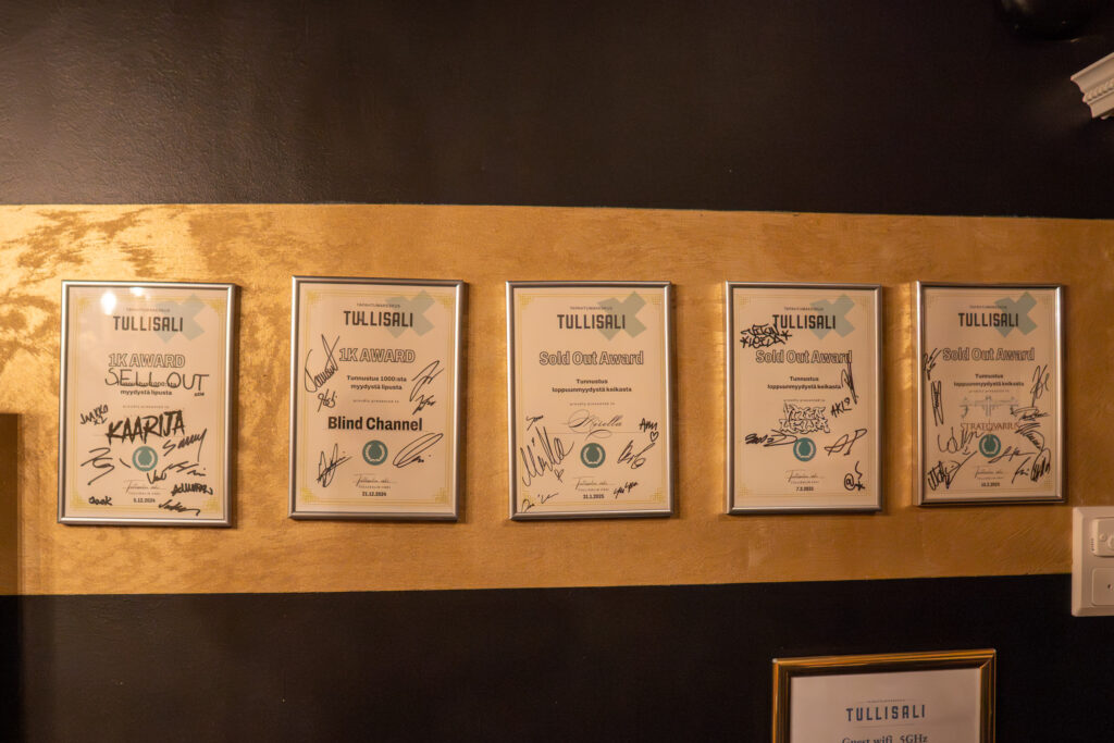 Tullisalin takahuoneessa – tai kuten se yleisemmin tunnetaan – bäkkärillä on esiintyjien osalta nyt tyhjää. Seinät ovat kuitenkin täynnä nimmaroituja, tuhannen myydyn lipun rajaa juhlistavia tauluja. Tauluista voi bongata lukuisia kotimaisia kärkiartisteja ja -yhtyeitä aina Mirellasta Battle Beastiin. Suopanki pitää huolen, että seinille nousee tulevaisuudessa vielä lisää tauluja. Loppuunmyytyjä keikkoja on luvassa lähitulevaisuudessa ainakin poptähti Isac Elliotilla sekä Kuumaa-yhtyeellä.